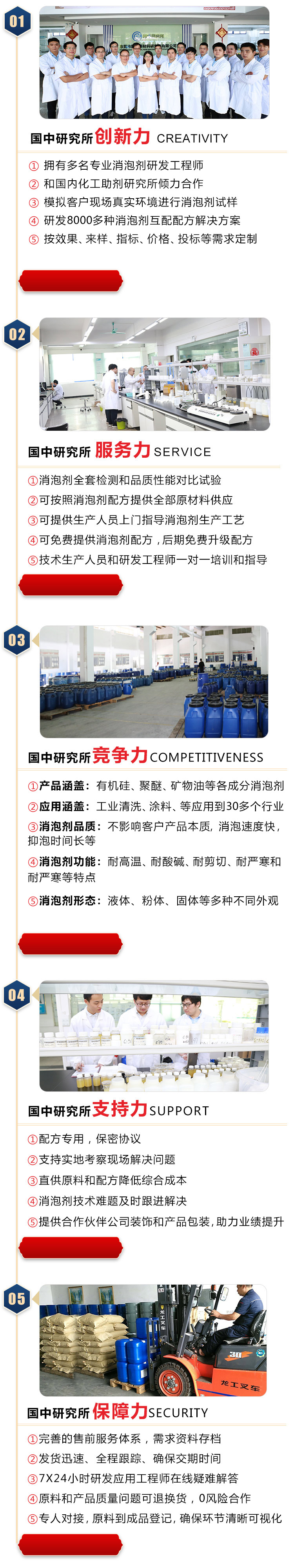 東莞市國中新材料研究所有限公司是一家集科研、生產(chǎn)、銷售、服務(wù)于一體的新材料研究所,擁有3000平方的研發(fā)基地,擁有一支專業(yè)消泡劑研究人員組成的研發(fā)團隊。成立以來一直致力于消泡劑原材料、成品的開發(fā)以及客戶技術(shù)服務(wù),長期與國內(nèi)研究所合作研發(fā)消泡劑配方。